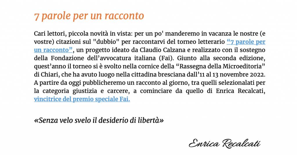 Sette libri più una newsletter, queste le novità del nostro Torneo Letterario «7 parole per un racconto». Giusto oggi abbiamo ritirato i primi sette libri della collana 7parole, quelli con i racconti premiati alla Microeditoria di Chiari, illustrati dalla pittrice Annamaria Gallo. Li abbiamo tirati in 77 copie ciascuno su carta pregiata Fedrigoni: insomma, sono proprio uno spettacolo… Alcune copie le hanno acquistate gli Autori, altri concorrenti hanno scelto questo o quel racconto, qualcuno si è preso tutti e 7 i libri per i regali di Natale… Insomma, se anche voi volete qualche copia, fatevi sotto. E l’altra novità? Bene, a partire da oggi la newsletter serale del quotidiano «Il Dubbio», edito dalla Fondazione dell’Avvocatura Italiana, presenta i racconti inviati al recente Torneo legati alle tematiche della Giustizia, ai diritti e alle problematiche carcerarie. Non a caso il primo racconto pubblicato è quello della vincitrice del Premio FAI, Enrica Recalcati. E le novità mica finiscono qui, solo che non voglio dirvele tutte insieme, me le tengo di scorta per la prossima volta. Questione di giorni, promesso.