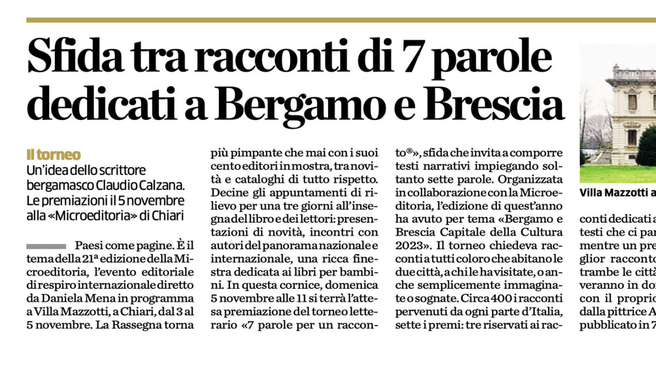 Sì, anche L’Eco di Bergamo invita tutti quanti alla Rassegna della Microeditoria e in particolare alla premiazione del nostro magico 7 parole. L’appuntamento da non perdere è per questa domenica 5 novembre, ore 11, nel tendone allestito nel parco di Villa Mazzotti a Chiari. Ecco l’articolo completo.