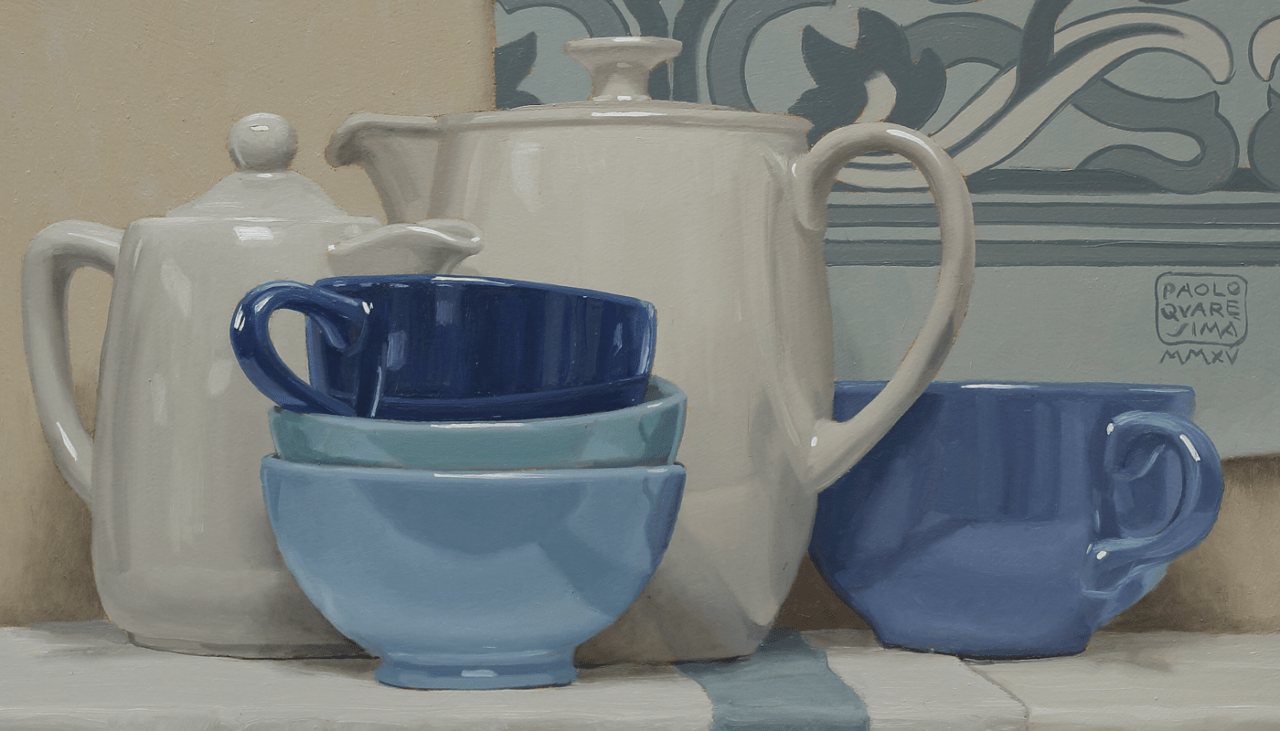 No, non sono nature morte quelle di Quaresima. Rappresentano gli “strumenti feriali della vita“, come ama definirli l’artista meranese: indumenti, stoviglie e utensili vari, oggetti eterogenei che pure stanno a meraviglia dove stanno. I suoi quadri restituiscono dignità agli oggetti che raramente badiamo di uno sguardo. Il risultato? Lo stupore per la convivenza tra le cose, il supremo silenzio della scena, la ritrovata quiete interiore di chi osserva.