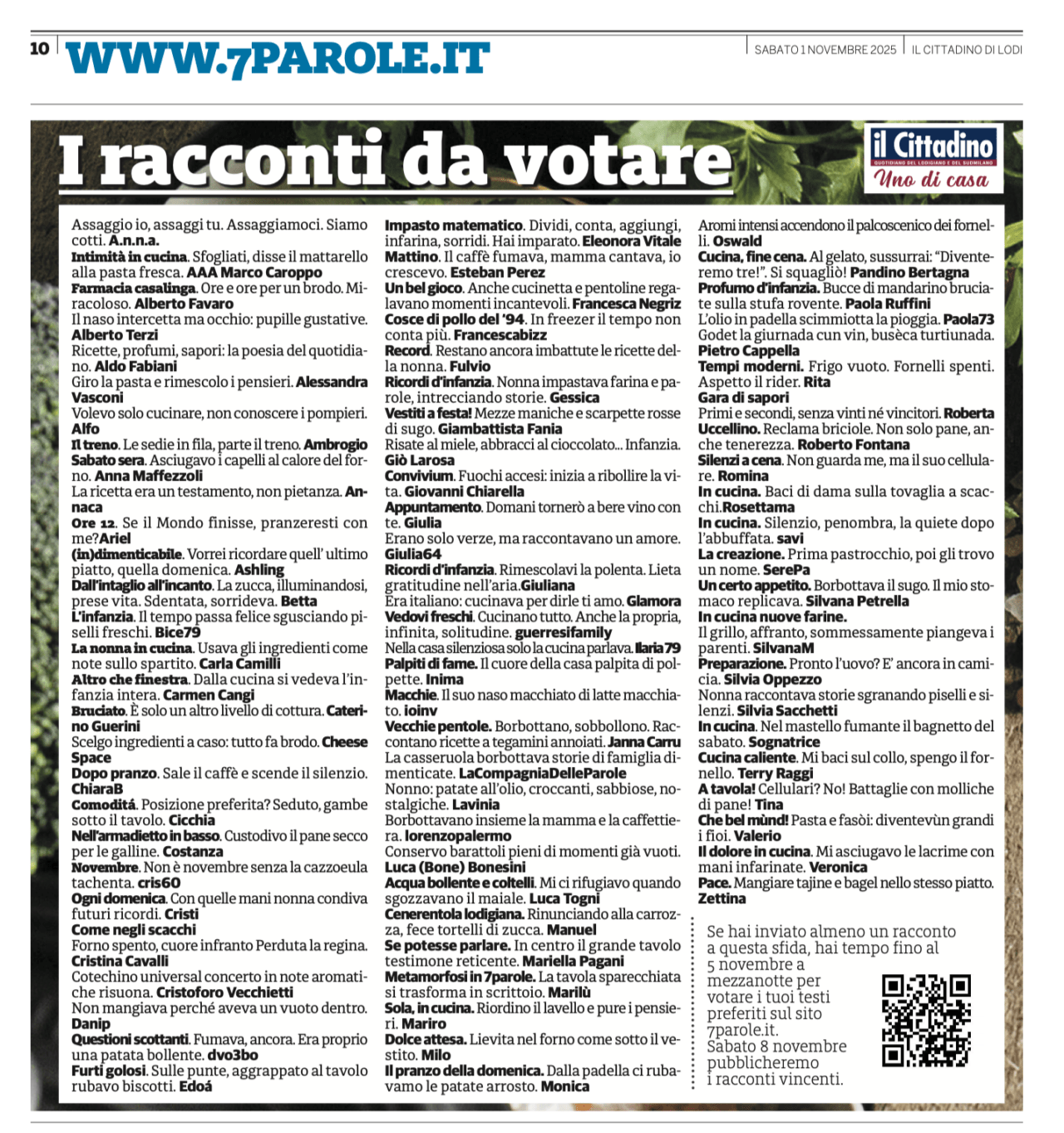Sabato scorso Il Cittadino di Lodi ha pubblicato l’intero elenco dei racconti al voto per la sfida In Cucina. Sono ben 79, opera di altrettanti Autori e Autrici, trovi l’intero elenco qui a seguire.