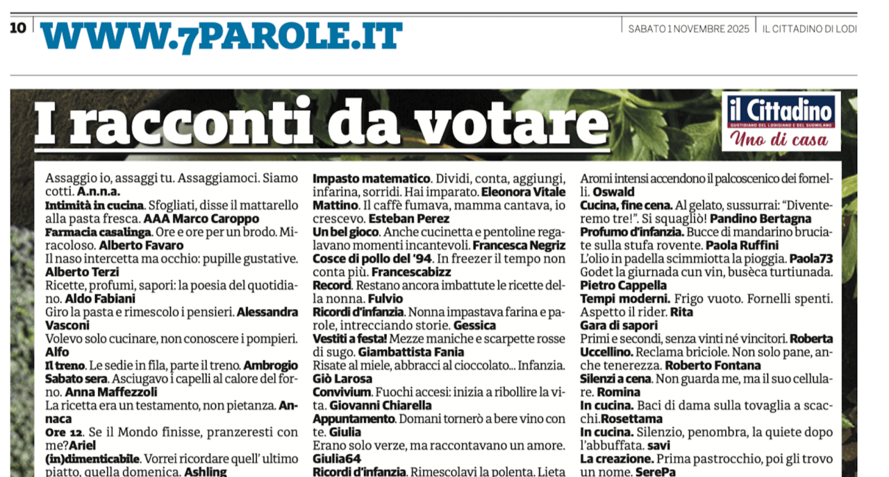 Come ogni sabato, anche questa settimana Il Cittadino di Lodi ha pubblicato i racconti migliori dedicati alla Cucina. A seguire trovi la pagina del quotidiano, con i 7 racconti preferiti e i 12 segnalati. Interessante […]Leggi l'articolo