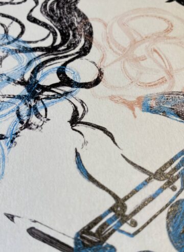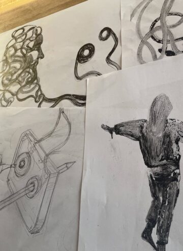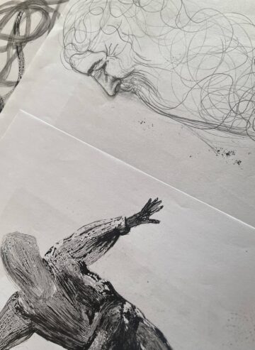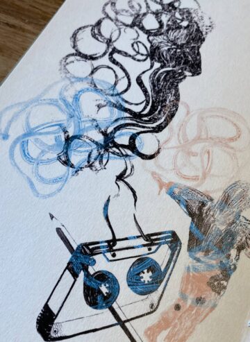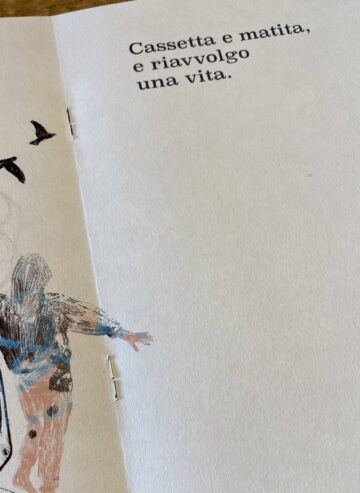 Una figura femminile in equilibrio su una matita, la cassetta svolge il suo nastro. Dal groviglio perduto indovini una certa figura, e due uccelli si librano in volo.